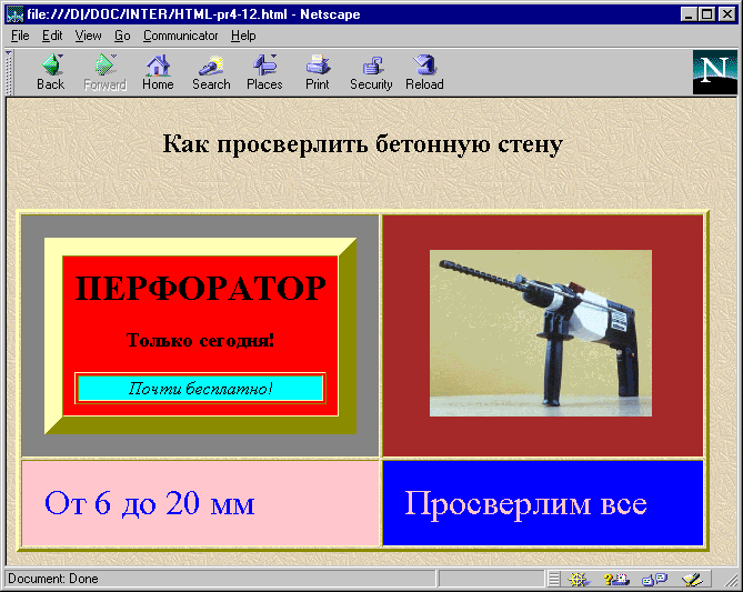 Рис. 1.21. Создание выпуклых элементов Создание разноцветных таблицВедущие броузеры, позволяют отображать некоторые цвета. Есть несколько способов раскрасить таблицу, в основном они зависят от используемого броузера. Цветные границы в Netscape NavigatorВы не только можете окружить таблицу красивой рамкой, но еще и задать для нее цвет, отличный от цветов текста и фона. Создайте простой серый GIF (или любой GIF, который вы хотели бы иметь в качестве фона) и определите его в таге <ВODY> как фон страницы. Затем задайте цвет фона страницы. В результате ваш таг <ВОDY> будет выглядеть примерно так: <BODY ВАСКGROUND="сооlbg.gif" ВGCOLOR=" # FF0000"> Вы создали двойной фон - GIF и заданный цвет. В результате фоновый цвет будет виден на всех границах таблиц и горизонтальных линиях (<НR>). Вне зависимости от того, является ли ваш фоновый GIF серым или нет, цветные линии и границы таблиц будут заметно выделяться. Если фоновый GIF не слишком сложно устроен, время загрузки страницы лишь немного возрастет. На приведенном ниже примере показано какие, широкие возможности дает использование цвета в HTML и в частности в таблицах. Пример 1.21 <HTML> <BODY BACKGROUND="bgr.gif" BGCOLOR="YELLOW" > <CENTER> <TABLE BORDER=3 CELLPADDING=20> <CAPTION ALIGN=TOP><H2>Как просверлить бетонную стену</H2></CAPTION> <TR> <TD BGCOLOR=GRAY> <TABLE CELLPADDING=10 CELLSPACING=0 BORDER=16> <TD BGCOLOR=RED ALIGN=CENTER> <H1>ПЕРФОРАТОР</H1> <H3>Только сегодня!</H3> <TABLE BORDER WIDTH=100%> <TR> <TD BGCOLOR=AQUA ALIGN=CENTER><I>Почти бесплатно!</I></TD> </TR> </TABLE> </TABLE> <TD WIDTH=50% BGCOLOR=BROWN ALIGN=CENTER> <IMG SRC="perfor1.gif" WIDTH=200 HEIGHT=150> </TD> </TR> <TR> <TD BGCOLOR=PINK> <FONT SIZE=6 COLOR=BLUE>От 6 до 20 мм</FONT> </TD> <TD BGCOLOR=BLUE> <FONT SIZE=6 COLOR=PINK>Просверлим все</FONT> </TD> </TR> </TABLE> </CENTER > </BODY> </HTML>