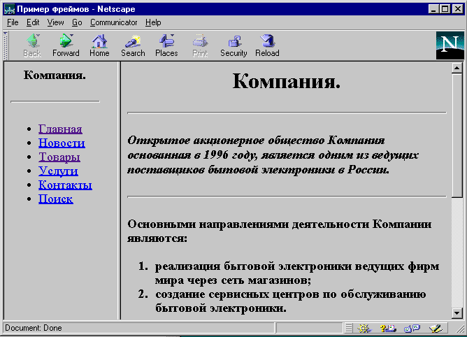 1.5. ФреймыЧто такое фрейм? В каком-то смысле фрейм - это именно то, что означает данное слово: рамка вокруг картинки, окошко или страница. Вводя таг <FRAME>, дизайнер НТМL-страницы разделяет экран броузера на части. В результате человек, просматривающий страницу, может изучать одну часть страницы независимо от остальной части. Фактически броузер, распознающий фреймы, загружает разные страницы в разные секции, или фреймы, экрана. Например, вы можете построить страницу таким образом, что фирменный знак будет зафиксирован в верхней части экрана, в то время как остальную часть страницы пользователь пролистывает обычным способом. Можно расположить сбоку кнопки навигации, которые не перемещаются, когда читатель щелкает их мышкой, так что изменяется только часть экрана, а сама полоска навигации остается неподвижной. Для чего можно использовать фреймыХотя фиксация фирменного знака или средств навигации - наиболее очевидные способы использования фреймов, это не значит, что их возможности тем и исчерпываются. Просто перечисленные решения - первое, что приходит в голову дизайнерам, когда они думают о том, как использовать фреймы. Но каждый раз, когда в экран броузера вставляется фрейм, вы урезаете территорию, на которой можно было бы разместить данные. Чем больше вы вводите фреймов, тем меньше остается полезного пространства и тем скорее вы запутаете своих читателей, незнакомых с навигацией на Web-странице с фреймами. Например, разумно хранить в фрейме логотип компании только на первых нескольких уровнях самых важных страниц, а основные данные показывать без фреймов. Как работают фреймыНа первый взгляд, фреймы - это нечто сложное, но их легче понять, если провести аналогию с ячейками таблицы. Расположение фреймов на экране задается почти так же, как ячеек в таблице: таги и атрибуты работают так же, как их табличные родственники. Однако, хотя аналогия между единичным фреймом на странице и ячейкой таблицы полезна, нужно помнить, что есть и отличия. Содержимое ячейки задано в коде HTML-страницы с таблицей. Текст или графика, составляющие содержимое таблицы, фактически вводятся на той же самой странице HTML, что и таг или атрибут, описывающие таблицу. Напротив, экран с фреймами описывается в НТМL-странице, называемой (frameset ). Содержимое же фрейма - это отдельная HTML-страница, которая может находиться где угодно - в другом каталоге, на локальном сервере или на удаленном узле где-то в сети. Фреймовая структура определяет только способ организации экрана с фреймами и указывает, где находится начальное содержимое каждого фрейма. Для всех фреймов задаются URL, описывающие местонахождение их данных. Как правило, на странице с фреймовой структурой нет содержимого фреймов. Такая страница обычно невелика - она описывает только кадровую структуру экрана. Когда документ загружается в фрейм, вы можете щелкать мышкой на ссылке в этом документе, что вызовет появление связанных документов в других кадрах, заданных в фреймовой структуре. Создание простой страницы с фреймамиСоздадим, для лучшего понимания, пару простых страничек с фреймами, чтобы стало понятно, каково строение НТМL страницы с фреймами и для чего нужны основные таги и атрибуты. Построим страницу с двумя фреймами. Зададим слева фрейм оглавления с заголовками статей, а справа поместим страницу с самими с