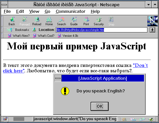 В данном примере среди текста документа расположена гипертекстовая ссылка "Don`t click here". Если ее выбрать при просмотре (кликнуть мышкой), то на экране появится окно-предупреждение с вопросом: "Do you speak English?". Генерация этого окна осуществляется специальным методом window.alert, который выполняется при выборе гипертекстовой ссылки. Если быть более точным, то в качестве URL информационного ресурса, который следует загрузить при переходе по данной гипертекстовой ссылке, используется схема JavaScript - расширение спецификации URI для программирования сценариев просмотра гипертекстовых документов World Wide Web. В этом случае выполнение JavaScript-программы происходит при выборе гипертекстовой ссылки, а сам код программы записан как URL.