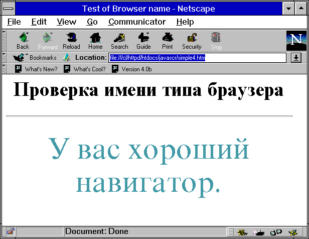 Рис.2.2. При загрузке был определен Netscape Navigator в качестве программы-браузера HTML-страниц Вообще говоря, проверить тип программы просмотра можно на сервере протокола HTTP и передать программе просмотра уже готовую страницу без условной генерации ее содержания. Но это возможно только в том случае, когда автор страницы имеет возможность программировать на машине где установлен сервер и имеет возможность администрировать этот сервер. В ряде случаев, когда место под Website арендуется и в договоре аренды нет пункта, обеспечивающего управление ресурсами сервера, в этом случае программы с условной генерацией содержания страниц бывают чрезвычайно полезными. Другой случай - это работа в локальном режиме без сервера. Здесь JavaScript является единственным средством управления просмотром. Существует еще ряд случаев, когда применение контейнера SCRIPT в теле документа является вполне оправданным, но на них мы остановимся позже в контексте решения конкретных задач управления сценариями просмотра. Однако, чаще всего, текст JavaScript-кода размещают в виде описания функций в заголовке документа, что делает использование такого кода более удобным. Связано это с двумя моментами, которые следует учитывать при написании JavaScript-программ: область действия описания программы (из каких частей документа или страницы она видна, а следовательно, на нее можно сослаться как на функцию, и принципы интерпретации кода при просмотре документа. Если код размещается в теле документа, то он интерпретируется только в случае переразметки отображаемого документа (загрузка, изменение параметров окна, перезагрузка). Если текст размещен в заголовке, то на него можно сослаться из любого места документа, а точнее из любого обработчика событий, которые указываются как атрибуты HTML-тагов. Вернемся теперь снова к примеру 2.13, но только разместим теперь код JavaScript не в тексте документа, а в отдельном файле: Пример 2.14. Размещение скрипта в отдельном файле (netscape.jsc) <HTML> <HEAD> <title>Test of Browser name</title> </HEAD> <BODY> <h1 align=center>Проверка имени типа браузера</h1> <hr> <script language=JavaScript src=netscape.jsc> </script> </BODY> </HTML> В данном случае текст условной генерации страницы размещен во внешнем файле. При загрузке страницы этот текст докачивается программой просмотра и исполняется так же, как если бы он размещался в документе. Любопытно, что при просмотре текста документа через опцию "View Source" текст скрипта не отображается, что дает возможность скрыть его содержание от пользователя. В самом файле, который содержит конструкции JavaScript, HTML-таги не используются: Пример 2.15. Содержание файла netscape.jsc, ссылка на который установлена в атрибуте SCR тага <SCRIPT > из примера 6