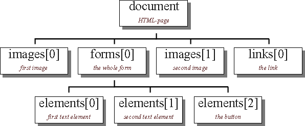 Разумеется, мы должны иметь возможность получать информацию о различных объектах в этой иерархии и управлять ею. Для этого мы должны знать, как в языке JavaScript организован доступ к различным объектам. Как видно, каждый объект иерархической структуры имеет свое имя. Следовательно, если Вы хотите узнать, как можно обратиться к первому рисунку на нашей HTML-странице, то обязаны сориентироваться в иерархии объектов. И начать нужно с самой вершины. Первый объект такой структуры называется document. Первый рисунок на странице представлен как объект images[0]. Это означает, что отныне мы можем получать доступ к этому объекту, записав в JavaScript document.images[0].