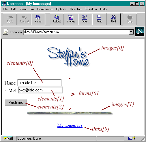 Итак, мы имеем два рисунка, одну ссылку и некую форму с двумя полями для ввода текста и одной кнопкой. С точки зрения языка JavaScript окно браузера - это некий объект window. Этот объект также содержит в свою очередь некоторые элементы оформления, такие как строка состоятия. Внутри окна мы можем разместить документ HTML (или файл какого-либо другого типа - однако пока мы все же ограничимся файлами HTML). Такая страница является ни чем иным, как объектом document. Это означает, что объект document представляет в языке JavaScript загруженный на настоящий момент документ HTML. Объект document является очень важным объектом в языке JavaScript и Вы будете пользоваться им многократно. К свойствам объекта document относятся, например, цвет фона для web-страницы. Однако для нас гораздо важнее то, что все без исключения объекты HTML являются свойствами объекта document. Примерами объекта HTML являются, к примеру, ссылка или заполняемая форма.