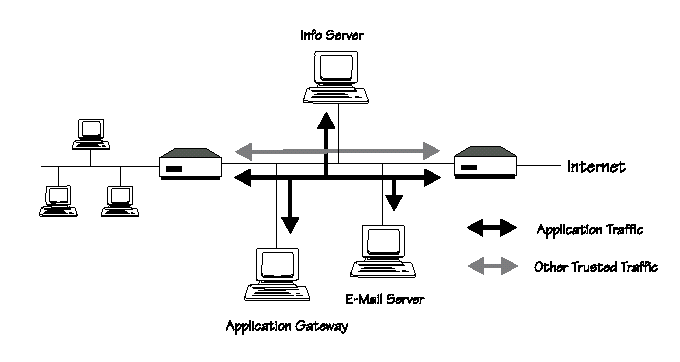 Внешний маршрутизатор предоставляет возможность взаимодействия с Интернетом только конкретным системам в изолированной подсети, и блокирует весь другой трафик в Интернет, от других систем в изолированной подсети, которые не имеют права инициировать соединения (таких как модемный пул и информационный сервер ). Также он может использоватьс для блокирования пакетов NFS,NIS или других уязвимых протоколов, которые не должны передаваться от или к хостам в изолированной подсети. Внутренний маршрутизатор передает трафик к/от систем в изолированной подсети согласно следующим правилам: