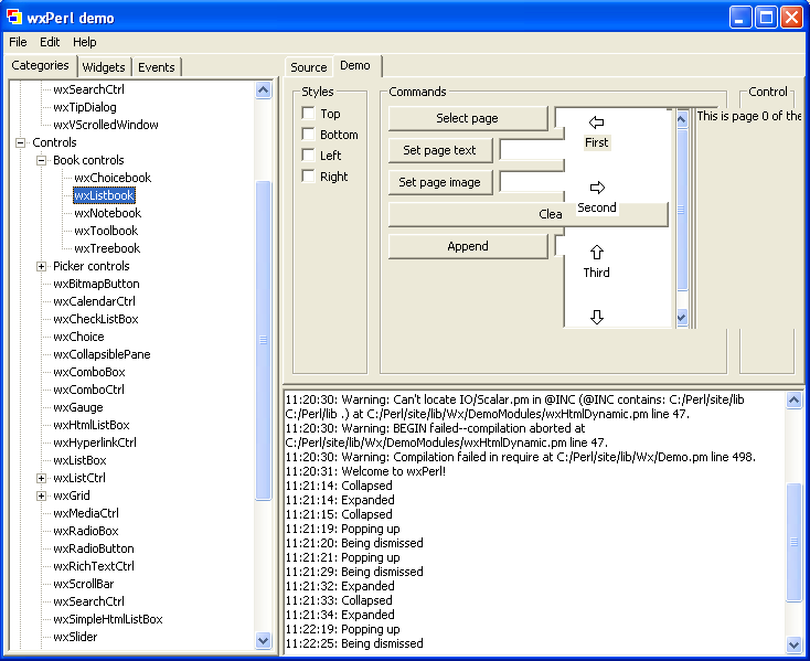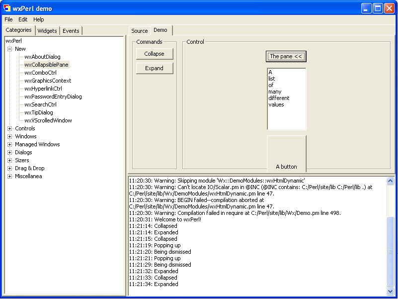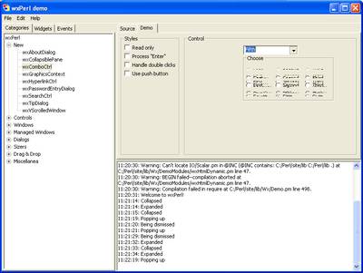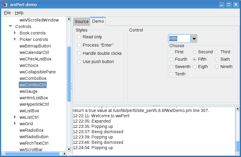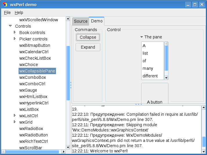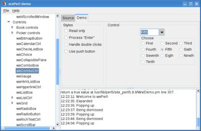 Wx::DemoДля изучения wxPerl очень полезно ознакомится с подборкой демонстрационных программ. Все программы объединены под одним интерфейсом: сразу можно посмотреть как на внешний вид, так и на исходный текст приложения. Соответствующий модуль называется Wx::Demo. Пользователи Windows могут установить этот модуль из упомянутого выше PPM-репозитория. На этот раз никаких сюрпризов нет. Запускной файл называется wxperl_demo.pl Wx::Demo даёт хорошее представление о возможностях wxPerl, но также обнажает и некоторые недоработки. Сравните виджет wxComboCtrl в Linux и в Windows: А вот ещё пара примеров: при масштабировании окна виджеты "наезжают" друг на друга: В целом, идея использования виджетов хост-системы очень логична. Однако, встречаются виджеты, специфичные для какой-то конкретной платформы. К таким виджетам, например, относится GtkExpander. Обратите внимание как выглядит этот виджет в Linux (напомню, в Linux wxWidgets базируется на GTK+) и в Windows: ВыводыВ целом, wxPerl достаточно интересный и перспективный проект. Вместе с тем, стоит признать, что пока уровень поддержки тулкита wx в языке Perl существенно скромнее чем, скажем, в Python или C++. Таким образом, остановив свой выбор на wxPerl будьте готовы приложить дополнительные усилия на установку и настройку своего окружения, а также на поиски документации и дргугих справочных материалов. Ссылки