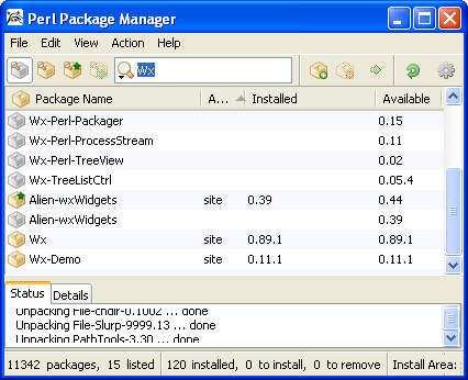 Страница со скриншотами wxPerl также давно не обновлялась: на ней представлен wxPerl версий от 0.14 (апрель 2003) до 0.21 (декабрь 2004). Ну и, наконец, обидно, что по wxPerl нет книги, хотя по тому-же wxPython книга есть. Установка в LinuxЕсли вам повезло и в вашем дистрибутиве оказался соответствующий пакет, то можете смело пропустить этот раздел. Если нет, то придется собрать wxPerl вручную из CPAN. Для начала необходимо установить саму библиотеку wxWidgets с заголовочными файлами. К примеру, в Mandriva Linux 2008 необходимые пакеты называются libwxgtku2.8 и libwxgtku2.8-devel соответственно. Обратите внимание на букву "u" в названиях пакетов. Она означает, что wxWidgets скомпилирован с поддержкой Unicode. После того как библиотеки поставлены, установите следующие Perl-модули: Wx, Alien::wxWidgets и ExtUtils::XSpp. Установка в WindowsПрежде чем приступить к установке wxPerl, необходимо скачать и проинсталлировать библиотеку wxWidgets. Почти наверняка этот шаг не вызовет никаких сложностей. Далее следует установить wxPerl. Если вы пользуетесь дистрибутивом ActivePerl, то проще всего подключить PPM-репозиторий, который поддерживает Марк Дутсон (Mark Dootson), и установить модуль Wx отдуда. Однако, необходимо иметь в виду две вещи: во-первых, в репозитории может быть не самая последняя версия Wx (на момент написания этих строк - 0.89.1), а во-вторых, необходимо установить правильную версию пакета Alien-wxWidgets, от которого зависит Wx. На момент написания этих строк в репозитории находятся две версии Alien-wxWidgets: 0.39 и 0.44 По умолчанию, разрешая зависимости программа PPM выберет самую свежую версию - 0.44. Проблема в том, Alien-wxWidgets версии 0.44 не будет работать с Wx версии 0.89.1! Для того чтобы обойти эту неприятность следует явно установить Alien-wxWidgets версии 0.39, а затем уже установить Wx. На выяснение этого "очевидного" факта ушло более часа поисков. Впрочем, возможно на момент прочтения этих строк данная проблема будет уже устранена.