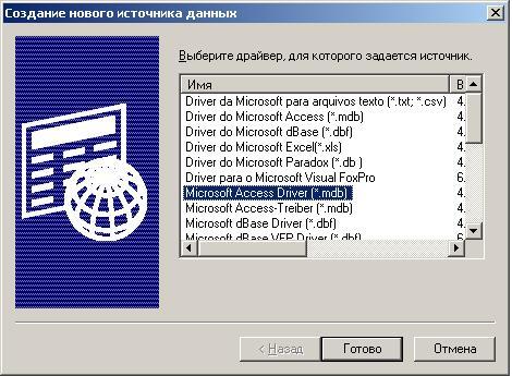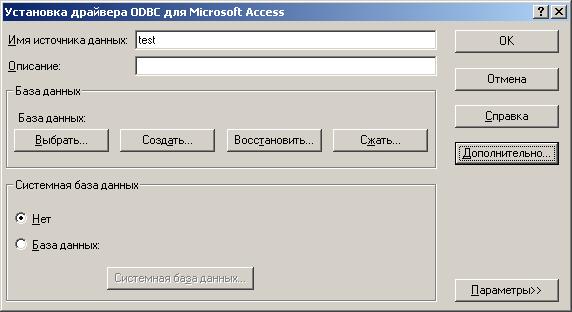 Далее, в появившемся окне (рис.1) ![]() рис. 1 ![]() рис. 2 и нажимаем кнопку готово. В поле ввода имя источника данных пишем имя, по которому впоследствии мы сможем обратиться к нашей базе данных, например, test, затем нажимаем кнопку выбрать и указываем, где у нас на диске находится наш файл с БД (рис. 3) ![]() рис. 3 ![]() рис. 4 Теперь, когда у нас есть источник данных ODBC, мы можем воспользоваться