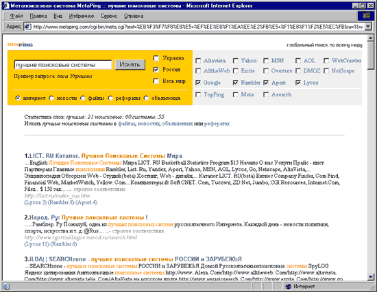 Рис.3 Стартовая страница MetaPing Пользователь выбирает, скажем, поиск по России, и вводит, например, такой запрос: "лучшие поисковые системы" (рис. 4).