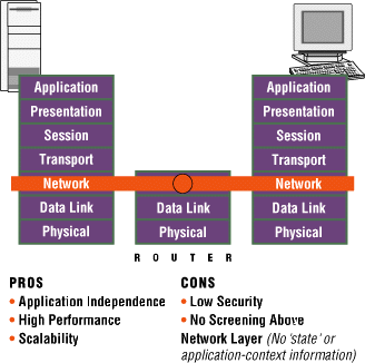 Исторически пакетные фильтры были реализованы на маршрутизаторах, условием фильтрации является определяемое пользователем выражение, например адрес IP. Они проверяют пакет на сетевом уровне и являются независимыми от приложения. Это позволяет им показывать высокую производительность и масштабируемость. Однако это вид firewall, обеспечивающий наименьшую защиту. Причина в том, что у пакетного фильтра нет информации о приложениях более высокого уровня и нет возможности отслеживать контекст данного соединения. Это делает их уязвимыми для хакеров. |