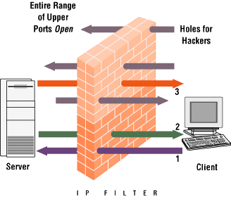 Пакетные фильтры могут выбирать один из двух вариантов действия для исходящих соединений FTP. Либо оставить полностью открытым верхнюю часть портов (выше, чем 1023), что позволит передавать файлы с использованием динамически назначаемого порта, но одновременно подвергнет угрозе внутреннюю сеть. Или полностью закрыть верхние порты для защиты внутренней сети, что полностью заблокирует другие службы. Такой компромисс между поддержкой приложений и безопасностью внутренней сети не отвечает требованиям сегодняшних пользователей. |