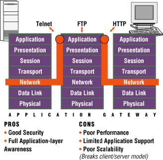 Шлюзы уровня приложения обеспечивают больший уровень безопасности, проверяя все прикладные уровни пакета. При принятии решения используют информацию о текущем контексте. Однако, делая это, они нарушают модель клиент-сервер. Каждое соединение клиент-сервер требует двух соединений: одно от клиента к firewall и другое от firewall к клиенту. Вдобавок, каждый посредник (proxy) требует отдельного прикладного процесса или демона, затрудняя масштабирование и поддержку новых приложений. |