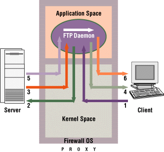 При использовании FTP proxy, шлюз приложений удваивает число сессий, действуя, как посредник между клиентом и сервером. Несмотря на то, что такой подход снимает ограничения пакетного фильтра, обеспечивая функцию принятия решения информацией о приложении, он делает это за счет неприемлемых затрат производительности. К тому же, каждый тип сервиса требует своего proxy, так что количество доступных сервисов и их масштабируемость ограничены. И, наконец, этот подход открывает операционную систему внешним угрозам. |