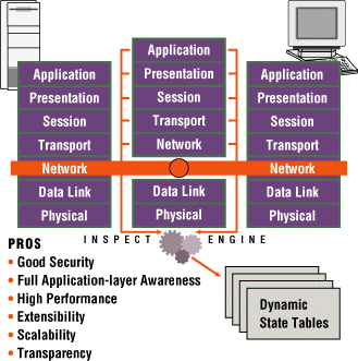 Технология stateful inspection FireWall-1 решает проблемы двух предыдущих подходов, обеспечивая полный контроль на уровне приложения без нарушения модели клиент-сервер. В случае stateful inspection пакет перехватывается на сетевом уровне, после чего его проверкой занимается виртуальная машина INSPECT. Она извлекает информацию о контексте, необходимую для принятия решения, со всех уровней и сохраняет эту информацию в динамических таблицах для проверки последующих пакетов. Это обеспечивает решение с высоким уровнем безопасности, дающее максимальную производительность, масштабируемость и расширяемость. |
