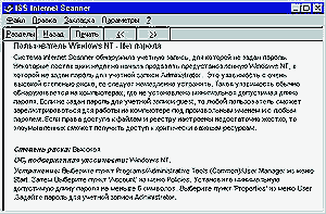 Рис. 2. Вид экрана описания Последняя версия Internet Scanner имеет возможность добавлять собственные проверки уязвимых мест, например описанных в Bugtraq или обнаруженных в процессе работы. Подсистема моделирования атак — Advanced Packet eXchange — поставляется бесплатно c Internet Scanner и позволяет администратору создавать допустимые и запрещенные IP-пакеты, с помощью которых он может проверить функционирование и эффективность защитных механизмов маршрутизаторов, межсетевых экранов, Web-серверов, системного и прикладного ПО. System Scanner и Security ManagerОдной из главных задач, на которые нацелены системы анализа защищенности, разработанные компанией ISS, является сбор информации о ПК-клиентах. Иногда это удается сделать дистанционно с помощью Internet Scanner, но часто разумнее проводить такую операцию, используя локальный компьютер (например, при проверке «слабых» паролей, наличия установленных пакетов модификаций, обновлений ОС или приложений и т. п.). На первый взгляд, для анализа уязвимостей ОС Windows и Unix вполне достаточно Internet Scanner. Но дополнительный анализ, осуществляемый System Scanner (S2), способствует значительному повышению уровня защищенности. Как правило, общий анализ защищенности реализуется только на уровне сети, без локального сканирования на уровне ОС и без анализа защищенности приложений. System Scanner как бы обеспечивает взгляд на сеть «изнутри», обнаруживая «слабые места», которые не проявляются при дистанционном сканировании через сеть, но весьма опасны для Unix- и Windows-систем. Например, переполнение буфера (buffer overflow), может использоваться злоумышленником, в том числе с паролем «Guest», для получения привилегированного (root) доступа. Весьма серьезной угрозой для работоспособности информационных систем является неправильная работа пользователя. Сканирование, обеспечиваемое S2, дает более детальный анализ его деятельности, чем сканирование с помощью систем дистанционного анализа защищенности на уровне сети. System Scanner позволяет проверять файлы .rhost, применять словарь часто используемых паролей, а также обнаруживать программы-«анализаторы протокола» типа «sniffer». Любой системный администратор заинтересован в информации об установленных patches (модификациях). Благодаря своим встроенным функциям S2 не только обнаруживает уже установленные patches, но и выявляет необходимые модификации, имеющиеся у поставщиков программно-аппаратного обеспечения. Подсистема Security Manager во многом аналогична системе System Scanner и также проводит анализ защищенности на уровне ОС. Однако Security Manager поддерживает гораздо больше платформ и ОС, чем S2 (в том числе SCO OpenServer и UnixWare, Netware), и обладает возможностью добавления своих собственных проверок. Все указанные достоинства реализованы ISS вместе с купленной ею компанией March Information Systems (из Великобритании). В конце III квартала текущего года компания ISS планирует интегрировать системы System Scanner и Security Manager в единую систему анализа защищенности на уровне ОС. Database ScannerПроблемы, связанные с безопасностью баз данных, идентифицирует ПО Database Scanner. В этом ПО реализованы проверки подсистем аутентификации, авторизации и контроля целостности; дополнительно выявляется соответствие СУБД требованиям перехода к 2000 г. Встроенная база знаний (Knowledge Base), доступная непосредственно из создаваемых отчетов, содержит перечень рекомендуемых корректирующих действий для устранен
