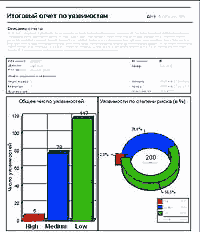 Рис. 1. Типовой отчет о защищенности сети, полученный с помощью Internet Scanner Настройка на конкретное сетевое окружение организации облегчается за счет шаблонов для поиска тех или иных «слабых мест». Все 600 уязвимостей, обнаруживаемых Internet Scanner, разделены на 26 категорий, по которым можно создавать и собственные новые шаблоны. Продукт ISS обеспечивает такую уникальную проверку, как определение работающих в сети модемов. С ее помощью реально предотвращается несанкционированный доступ к корпоративной сети через модем в обход межсетевого экрана. Механизм генерации отчетов Internet Scanner позволяет выбирать из 30 готовых форм. Они позволяют получить как обобщенные данные об уровне защищенности всей организации (рис. 1), так и подробные отчеты, содержащие техническую информацию о том, где и какие «слабые места» обнаружены, а также инструкции по их устранению (например, пошаговые рекомендации по изменению системного реестра Windows или строки в конфигурационных файлах Unix, гиперссылка на FTP- или Web-сервер с обновлением, устраняющим уязвимость). Отчеты могут быть выведены не только на английском, но и на немецком, французском, испанском, португальском и, что примечательно, на русском языке. Русифицирована и подсистема описания уязвимостей (рис. 2.).
