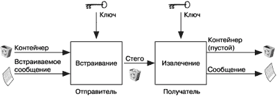 В качестве данных может использоваться любая информация: текст, сообщение, изображение и т. п. В общем же случае целесообразно использовать слово "сообщение", так как сообщением может быть как текст или изображение, так и, например, аудиоданные. Далее для обозначения скрываемой информации, будем использовать именно термин сообщение. Контейнер - любая информация, предназначенная для сокрытия тайных сообщений. Пустой контейнер - контейнер без встроенного сообщения; заполненный контейнер или стего - контейнер, содержащий встроенную информацию. Встроенное (скрытое) сообщение - сообщение, встраиваемое в контейнер. Стеганографический канал или просто стегоканал - канал передачи стего. Стегоключ или просто ключ - секретный ключ, необходимый для сокрытия информации. В зависимости от количества уровней защиты (например, встраивание предварительно зашифрованного сообщения) в стегосистеме может быть один или несколько стегоключей. По аналогии с криптографией, по типу стегоключа стегосистемы можно подразделить на два типа: