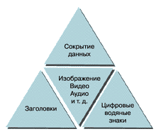 ПриложенияВ настоящее время можно выделить три тесно связанных между собой и имеющих одни корни направления приложения стеганографии: сокрытие данных (сообщений), цифровые водяные знаки и заголовки. Сокрытие внедряемых данных, которые в большинстве случаев имеют большой объем, предъявляет серьезные требования к контейнеру: размер контейнера в несколько раз должен превышать размер встраиваемых данных. Цифровые водяные знаки используются для защиты авторских или имущественных прав на цифровые изображения, фотографии или другие оцифрованные произведения искусства. Основными требованиями, которые предъявляются к таким встроенным данным, являются надежность и устойчивость к искажениям. Цифровые водяные знаки имеют небольшой объем, однако, с учетом указанных выше требований, для их встраивания используются более сложные методы, чем для встраивания просто сообщений или заголовков. Третье приложение, заголовки, используется в основном для маркирования изображений в больших электронных хранилищах (библиотеках) цифровых изображений, аудио- и видеофайлов. В данном случае стеганографические методы используются не только для внедрения идентифицирующего заголовка, но и иных индивидуальных признаков файла. Внедряемые заголовки имеют небольшой объем, а предъявляемые к ним требования минимальны: заголовки должны вносить незначительные искажения и быть устойчивы к основным геометрическим преобразованиям.
