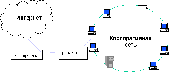 4. Коммерческие требованияКоммерческие и другие организации используют Интернет потому,что он предоставляет полезные сервисы. Организации должны принять решение - будут ли использоваться или нет сервисы на базе Интернета на основании анализа бизнес-плана или плана развития информационных технологий. Другими словами, организации должны проанализировать свои потребности, выявить потенциальные методы их удовлетворения и уточнить их после учета требований со стороны безопасности помимо влияния других факторов. Большинство организаций используют Интернет-сервисы для того, чтобы обеспечить улучшенное взаимодействие между подразделениями организации, или между организацией и ее клиентами, или чтобы сократить расходы на автоматизацию коммерческой деятельности. Безопасность должна учитываться прежде всего - один инцидент с безопасностью может зачеркнуть любые финансовые выгоды, предоставляемые соединением с Интернетом. Может также существовать несколько технологических решений для удовлетворения коммерческих потребностей организации, некоторые из которых могут быть обезопасены легче, чем другие. Рисунок 4.1 показывает типичную сетевую архитектуру в организации для использования Интернета. Рисунок 4.1 Типичная архитектура подключения к Интернету
