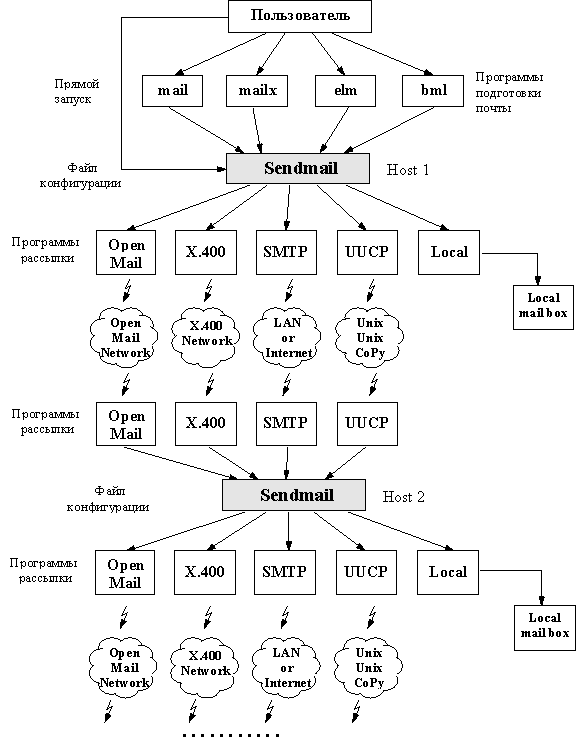 3.1. Программа SendmailОсновным средством рассылки почты в Internet является программа sendmail. Она обеспечивает работу модульной системы рассылки, которая предназначена для получения и отправки корреспонденции, а также управления программами подготовки и просмотра почтовых сообщений. Sendmail позволяет организовать почтовую службу локальной сети и обмениваться почтой с другими серверами почтовых служб через специальные шлюзы. Sendmail может быть сконфигурирована для работы с различными почтовыми протоколами. Обычно это протоколы UUCP (Unix-Unix-CoPy) и SMTP (Simple Mail Transfer Protocol). Sendmail работает как "отделение связи" обычной почтовой службы, которое принимает и пересылает почтовые сообщения. Sendmail может интерпретировать два типа почтовых адресов: