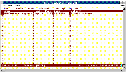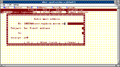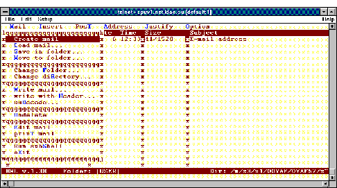 Рис. 3.6. Для перехода в падающее меню используется функциональная клавиша F9. Для отправки сообщения из режима редактирования следует нажать ALT+T или выйти в меню Post. При отправке почты следует заполнить специальную форму (рисунок 3.7). Bml предоставляет еще ряд возможностей, облегчающих прием, просмотр и отправку почты (поддерживает список часто используемых адресов, посылку сообщений в телеконференции Usenet, автоматическую вставку двоичных файлов в формате uuencode и их автоматическое извлечение из полученных сообщений и ряд других). В целом, следует признать, что bml является достаточно удобным персональным средством работы с почтой.