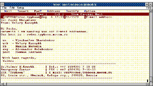 При запуске программы в рабочем поле отображаются полученные сообщения, первое из которых выделено цветом. Выделенное цветом сообщение - это текущее сообщение. При этом рабочее поле разбито на четыре столбца. В первом столбце указывается адрес отправителя, во втором - дата и время получения, в третьем - число строк и символов в сообщении, четвертый столбец - тема сообщения. Для просмотра сообщения надо при помощи клавиш-стрелок сделать интересующее пользователя сообщение текущим и нажать Enter. В рабочем поле экрана появится текст сообщения (рисунок 3.5).