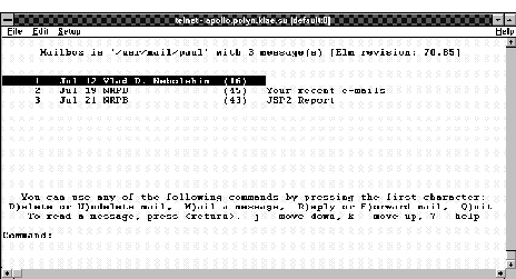 Рис. 3.7. Интерфейс elm Наиболее распространенной программой работы с почтой в Unix-системах является программа elm. Elm также, как и bml, является полноэкранным почтовым интерфейсом. Запуск программы осуществляется по команде elm: elm На экране появляется сообщение о версии системы, список полученных сообщений и список команд, которыми может воспользоваться пользователь. Следует обратить внимание на то, что некоторые версии elm способны подстраиваться под размер экрана автоматически. Пример экрана elm представлен на рисунке 3.8.