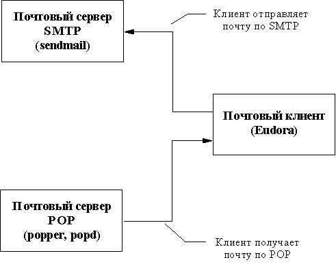 Рис. 3.9. Схема работы с почтовым сервером из-под MS-Windows и MS-DOS Такая схема предполагает, что пользователь имеет почтовый ящик на машине-сервере, которая не выключается круглосуточно. Все почтовые сообщения складываются в этот почтовый ящик. По мере необходимости, пользователь из своего почтового клиента обращается к почтовому ящику и забирает из него пришедшую на его имя почту. При отправке программа-клиент обращается непосредственно к серверу рассылки почты и передает отправляемые сообщения на этот сервер для дальнейшей рассылки. На рисунке 3.10 приведен экран Eudora, на котором представлено меню настройки и два почтовых ящика: принятых писем и отправленных писем. На этом рисунке в меню настроек хорошо виден POP Account - адрес пользователя на машине-сервере, SMTP-сервер и POP (Ph) сервер. Как видно из настроек, Eudora каждые 30 минут проверяет почтовый ящик пользователя и сообщает о получении новых писем. Кроме того, что Eudora позволяет читать просто письма в обычном почтовом формате Internet (RFC822), о котором пойдет речь в следующем параграфе, она распознает и новый формат, ориентированный на отображение мультимедийных почтовых сообщений MIME, который последнее время становится все более популярен в Internet.