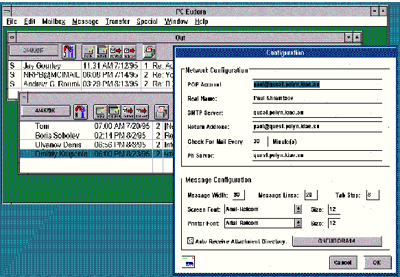 Рис. 3.10. Интерфейс Eudora для MS-Windows Для установки этого интерфейса требуются определенные знания и доступ к информации, которой располагает только системный администратор, поэтому предпочтительней обратиться именно к нему с просьбой об установке программы или за необходимой информацией (адреса машин серверов). Работа с Eudora чрезвычайно проста: надо выбирать при помощи мыши или клавиатуры интересующие вас сообщения и отправлять в "корзину" то, что бесполезно. И последнее замечание относительно работы из под MS-Windows с почтой в Internet. Если пользователь пишет только по-английски, то у него нет проблем с кодировкой и набором текста, но если он пишет по-русски и получает такие же сообщения, то сразу же возникают проблемы. Дело в том, что большинство почтовых сетей для обмена данными между серверами используют кодировку KOI8. Эта кодировка отличается как от кодировки для MS-DOS, так и от кодировки MS-Windows. Поэтому, возвращаясь к иллюстрации с настройками интерфейса Eudora, хочется обратить внимание читателя на поля "Send Font" и "Printer Font". В этих полях указан шрифт "Arial-Relcom", который разложен по кодировке KOI8, и используется для отображения и печати почтовых сообщений. Для того, чтобы правильно набирать сообщения, следует к стандартным раскладкам клавиатуры в драйвере клавиатуры (cyrwin, например) добавить раскладку для KOI8. При этом драйвер должен уметь менять раскладку по мере необходимости. В противном случае у пользователя будет возможность читать сообщения, но не набирать их. Назад | Содержание | Вперед |