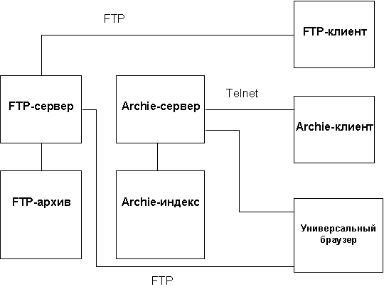FTP-архив можно использовать и в качестве архива коммерческого программного обеспечения, которое используется в компании, только в этом случае такой архив не должен разрешать анонимного доступа к хранящимся в нем ресурсам. Часто возможность авторизированного FTP-доступа используют и для обмена сообщениями, т.е. в качестве средства коммуникации. Это происходит обычно в том случае, когда система электронной почты по тем или иным причинам не работает. В настоящее время всю систему взаимодействия компонентов FTP-обмена можно представить в виде схемы представленной на рисунке 4.1. На этой схеме показано два важных технологических момента: во-первых, доступ к архиву можно осуществлять не только из специализированной программы-клиента, но и из универсального броузера, например Netscape Communicator или Microsoft Internet Explorer, а во-вторых, для поиска информации в FTP-архивах можно воспользоваться программой Archie.