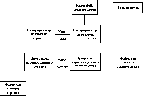 4.1. Протокол FTP (File Transfer Protocol)FTP (File Transfer Protocol или "Протокол Передачи Файлов") - один из старейших протоколов в Internet и входит в его стандарты. Обмен данными в FTP проходит по TCP-каналу. Построен обмен по технологии "клиент-сервер". На рисунке 4.2 изображена модель протокола.