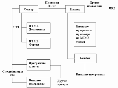 Рис. 3.26. Архитектура World Wide Web к середине 1996 года Java-applet'ы - это мобильные коды Java, ссылки на которые вмонтированы в тело документа. При доступе к такому документу программа просмотра пользователя предварительно анализирует документ на предмет наличия в нем такого типа ссылок, и, если они существуют, то подкачивает мобильные коды в свою память. Коды могут сразу выполняться по мере размещения их на компьютере пользователя, но могут активироваться и при помощи специальных команд. Как видно из рисунка, изменения коснулись и клиентской части технологии. В настоящее время происходит постепенный переход от простой классической архитектуры клиент-сервер к архитектуре с сервером приложений, в роли которого выступает программа-клиент. В частности, NCSA опубликовала спецификацию CCI (Common Client Interface) для разработки приложений для работы с сервисами World Wide Web через программу Mosaic. Завершая обсуждение архитектуры World Wide Web хотелось бы еще раз подчеркнуть, что ее компоненты существуют практически для всех типов компьютерных платформ и свободно доступны в сети. Любой, кто имеет доступ в Internet, может создать свой WWW-сервер, или, по крайней мере, посмотреть информацию с других серверов. 3.5.4.1. Язык гипертекстовой разметки HTML Язык гипертекстовой разметки HTML (HyperText Markup Language) был предложен Тимом Бернерсом-Ли в 1989 году в качестве одного из компонентов технологии разработки распределенной гипертекстовой системы World Wide Web. Разработчики HTML пытались решить две задачи: