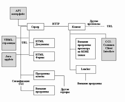 Рис. 3.25. Архитектура WWW-технологии База данных HTML-документов - это часть файловой системы, которая содержит текстовые файлы в формате HTML и связанные с ними графику и другие ресурсы. Особое внимание хотелось бы обратить на документы, содержащие элементы экранных форм. Эти документы реально обеспечивают доступ к внешнему программному обеспечению. Прикладное программное обеспечение, работающее с сервером, можно разделить на программы-шлюзы и прочие. Шлюзы - это программы, обеспечивающие взаимодействие сервера с серверами других протоколов, например ftp, или с распределенными на сети серверами Oracle. Прочие программы - это программы, принимающие данные от сервера и выполняющие какие-либо действия: получение текущей даты, реализацию графических ссылок, доступ к локальным базам данных или просто расчеты. Все, что было сказано до этого момента, можно отнести к классической схеме World Wide Web. В настоящее время следует говорить об изменении общей архитектуры. Как видно из рисунка 3.26, к середине 1996 года произошли некоторые изменения в архитектуре сервиса World Wide Web. Произошел возврат к модульной структуре сервера World Wide Web. Этот возврат был реализован в виде спецификации API. API - это спецификация разработки прикладных модулей, которые встраиваются в сервер, точнее редактируются совместно с модулями сервера. Применение во всех серверах многопотоковой технологии выполнения подзадач делает такой способ расширения возможностей сервера более экономичным с точки зрения ресурсов вычислительной установки, чем разработка CGI-скриптов. В дополнение к HTML активно стал применяться еще один язык разметки - VRML (Virtual Reality Modeling Language). В данном случае речь идет об описании трехмерных сен и возможности "бродить" по этим мирам. При этом в VRML также, как и в HTML предусмотрены гипертекстовые ссылки, что позволяет создавать смешанные базы данных, где информационный архив, например, можно представить в виде книг в библиотеке, среди которых может путешествовать автор, выбирая нужную ему тематику и источник, которые затем представляются в формате документа HTML.