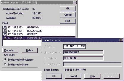 Экран 4: Просмотр сроков аренды DHCP позволяет легко определить, какой машине какой адрес назначен. В диалоге DHCP Manager (показанном на экране 1), выберите Scope, затем Active Leases. Для получения подробной информации о сроке аренды адреса для каждой из машин, выберите ее и нажмите Properties (или два раза щелкните на имени машины). На экране 4 показан список компьютеров моей офисной сети. Уникальный идентификатор (например, 004005000001) - это MAC-адрес сетевой платы. При необходимости отключить компьютер от сети, или после того как одна из машин была из нее удалена, соответствующий срок аренды можно аннулировать. Преимущества DHCPDHCP-сервер дает администратору ряд преимуществ. Главное - экономия времени, возникающая за счет отказа от ручного конфигурирования каждой машины. Новые компьютеры зачастую поставляются с предустановленной ОС. Если такой компьютер уже сконфигурирован в качестве DHCP-клиента, вы можете подключить его к сети, и ему сразу же будет автоматически присвоен IP-адрес. Если нет, то программа инсталляции NT при получении положительного ответа на соответствующий вопрос сама сконфигурирует систему, как DHCP-клиент. Если вы присваиваете IP-адреса вручную, вам необходимо хранить список уже выданных адресов. Администраторы нередко носят такие списки с собой, потому что они могут понадобиться им при конфигурировании новых компьютеров. Если на предприятии несколько администраторов, им приходится еще и координировать друг с другом присвоение адресов. DHCP знает, каким компьютерам какие адреса присвоены. Администраторам больше не придется опасаться опечаток при вводе адресов и случайного назначения одного и того же адреса нескольким компьютерам. Первичное присвоение IP-адреса - не единственное, на чем экономится время. DHCP упрощает и другие административные задачи. В частности, вы с легкостью сможете перемещать компьютер из одной подсети в другую. При необходимости передать кому-либо компьютер с него можно будет предварительно скопировать конфигурационные файлы на другой. Если не пользоваться DHCP, то оба компьютера имели бы в результате один и тот же IP-адрес. DHCP устраняет эту проблему и сокращает количество обращений в службу поддержки. Есть у DHCP преимущества и для пользователей. Пользователи ноутбуков, например, не смогут подключиться к сети, если адреса выдаются вручную. Однако клиенты, поддерживающие DHCP, по подключении сразу же получают новые действительные IP-адреса. Кроме того, DHCP позволяет осуществлять совместное использование IP-адресов. Допустим, у вас имеется 50 свободных адресов и отдел сбыта со штатом в 100 человек. Сотрудники отдела проводят в офисе всего 1-2 дня в неделю; таким образом, одновременно к сети всегда подключены только 30-40 компьютеров. Каждый раз при подключении к сети сотрудник получает IP-адрес. После отключения система восстанавливает адрес, чтобы выдать его следующему пользователю. Если ряд мобильных пользователей делят между собой несколько IP-адресов, некоторое их количество можно зарезервировать для тех, кому они больше всего нужны. Откройте диалог DHCP Manager, выберите Scope, Add Reservations. Таким образом вы сможете зарезервировать адрес для компьютера с определенным сетевым адаптером. Это может создать трудности, если пользователи поменяются адаптерами. Резервирование имеет свои отличия от присвоения фиксированного IP-адреса. Резерв