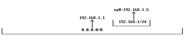 Вообще система маршрутизации (за исключением предельно примитивных случаев) древовидна, т.е. одни записи включают в себя другие. Частичное пересечение невозможно, ибо границы адресного пространства, на которое действует каждая запись, выровняны на размер этого пространства. Порядок хранения и просмотра таблицы может быть разный, но должен обеспечивать приоритет записей с маленьким пространством перед записями с большим пространством. В данном случае обращение к машине 192.168.1.9 попадает под юрисдикцию обеих записей, но обращаться к ней наша рабочая станция будет в соответствии с 192.168.1.0/24->ep0.