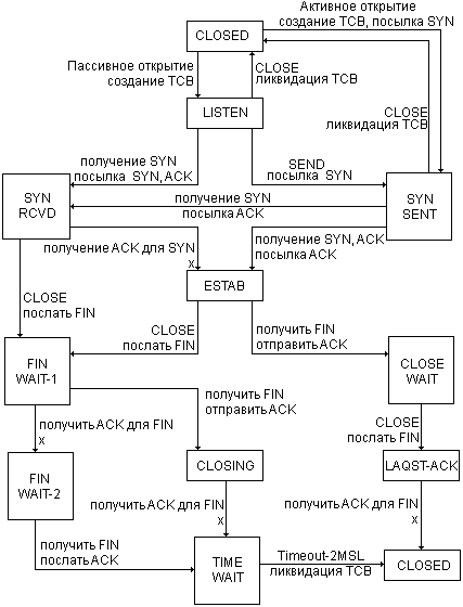 Процедура установки соединения использует флаг управления синхронизацией (SYN) и трижды обменивается сообщениями. Такой обмен называется трехвариантным подтверждением [3]. Соединение инициируется при встрече пришедшего сегмента, несущего флаг синхронизации (SYN), и ждущей его записи в блоке TCB. И сегмент и запись создаются пришедшими от пользователей запросами на открытие. Соответствие местного и чужого сокетов устанавливается при инициализации соединения. Соединение признается установленным, когда номера очередей синхронизированы в обоих направлениях между сокетами.