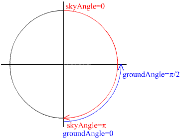 Так вот, у Вас есть две пары параметров: skyAngle/skyColor и groudAngle/groundColor. Первая пара - это как бы "небо" и раскрашивается сверху вниз (т.е. skyAngle=0 - вертикально над Вами), а вторая пара - это как бы "земля" и раскрашивается снизу вверх (т.е. groundAngle=0 - вертикально под Вами). Смотри рис.