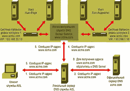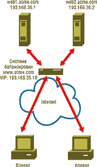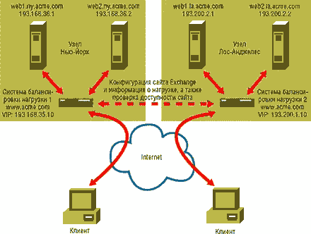 ЭКРАН 1. Система балансировки для одного сайта. Система балансировки нагрузки Web-серверов - это инструментальное средство, предназначенное для переадресации клиентских запросов на наименее загруженный или наиболее подходящий Web-сервер из группы машин, на которых хранятся зеркальные копии информационного ресурса. Клиент не подозревает о том, что обращается к целой группе серверов: все они представляются ему в виде некоего единого виртуального сервера. Предположим для примера, что мы обслуживаем один Web-сайт и имеем при этом два Web-сервера: web1.acme.com с IP-адресом 193.168.36.1 и web2.acme.com с IP-адресом 193.168.36.2. Эту конфигурацию иллюстрирует Рисунок 1. Представляя наш сайт пользователям Internet, система балансировки нагрузки использует имя виртуального компьютера (пусть это будет имя www.acme.com), а также виртуальный IP-адрес (VIP-адрес - скажем, 193.168.35.10). Чтобы связать имя виртуальной системы и соответствующий VIP-адрес с двумя нашими Web-серверами, мы должны опубликовать имя системы и ее VIP-адрес на сервере DNS. Система балансировки нагрузок постоянно контролирует нагрузки и степень готовности каждого из Web-серверов. Когда на узел www.acme.com заглядывает посетитель, его запрос поступает не на один из Web-серверов, а в систему балансировки нагрузки. Эта система и принимает решение о том, на какой сервер направить запрос. При этом она руководствуется такими критериями, как загрузка каждого подопечного сервера, а также соблюдает условия и правила, сформулированные администратором. Затем система балансировки нагрузки направляет запрос клиента соответствующему серверу (как правило, она же направляет ответ сервера клиенту, но это зависит от конкретной реализации). Системы распределения нагрузки могут к тому же обеспечивать выравнивание нагрузок нескольких Web-сайтов. Напомню читателям, что применение нескольких сайтов позволяет размещать серверы-"дублеры" (зеркальные Web-серверы) ближе к посетителям сайта и сокращать задержки при обмене информацией между сайтом и клиентами. Кроме того, при наличии нескольких Web-сайтов появляется возможность равномерно распределять нагрузку между ними, а также обеспечивать высокую степень их готовности и отказоустойчивость в случае нарушений в работе сайта (будь то по причине сбоев в системе энергоснабжения или из-за потери связи с Internet в вычислительном центре). При наличии нескольких сайтов, как показано на Рисунке 2, все системы балансировки нагрузок на всех сайтах имеют одно общее имя виртуальной системы, но разные VIP-адреса. Так, системе балансировки 1 на сайте 1 в Нью-Йорке присвоено имя виртуальной главной машины www.acme.com с VIP-адресом 193.168 .35.10. А балансировщик 2 на сайте 2 в Лос-Анджелесе, пользующийся тем же именем виртуальной главной машины, имеет уже другой VIP-адрес - 193.200.1.10. Связи всех систем балансировки с локальными Web-серверами устанавливаются так же, как и в случае с одним сайтом. Наряду с мониторингом нагрузок локальных серверов системы балансировки обмениваются со своими "коллегами" на других сайтах информацией о конфигурации и загрузке; при этом проверяется и степень готовности сайта. В итоге все системы балансировки имеют в своем распоряжении общую картину распределения нагрузок и готовности к работе различных узлов. При наличии нескольких сайтов системы балансировки нагрузок часто параллельно выполняют еще одну зад
