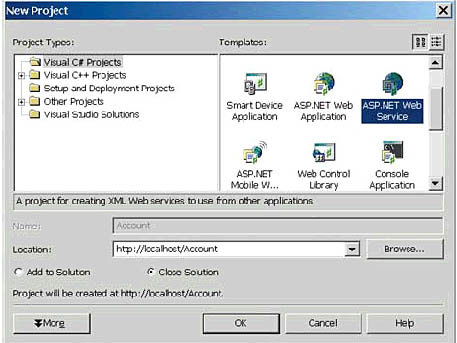 Этот фрагмент дает возможность оценить, насколько проще и нагляднее выглядит XML-RPC по сравнению с SOAP. Именно этим обусловлено меньшее время отклика в реализациях протокола XML-RPC. Справедливости ради стоит отметить, что Microsoft в качестве альтернативы предлагает использовать классические HTTP-GET и HTTP-POST методы передачи параметров, результат при этом возвращается в виде очень простой XML-строки. Время отклика в этом случае будет еще меньшим, чем у XML-RPC. Но эти альтернативные методы не могут работать со сложными типами данных, так что рассматривать их в качестве кандидатов для использования в реальных приложениях не имеет смысла. Возможности интеграции со средами разработкиВ качестве демонстрации того, насколько просто создать такое приложение с использованием современных средств разработки, приведем пример, в котором создадим веб-сервис в среде DOT.NET и Java-клиент, вызывающий этот веб-сервис (для демонстрации гетерогенных возможностей технологии). На практике подобная задача встречается довольно часто. Так что рассмотрим ситуацию из реальной жизни. Система учета супермаркета использовала в качестве базы данных MSSQL-сервер. Таким образом, серверная сторона была привязана к Win2k. Дабы сэкономить на лицензиях Win2k, для торговых терминалов решено было создать рабочее место оператора с использованием UNIX-машин. Для реализации проекта был создан свой протокол с использованием Berkley Sockets. Его создание и отладка отняла значительную часть то общего времени реализации проекта, которое в результате составило примерно полгода! Если бы разработчики использовали веб-сервисы, время разработки значительно сократилось бы. Приступим непосредственно к созданию нашего примера. В начале создадим проект сервиса. Для этой цели я использовал VS7.1. Запускаем его и создаем новый проект C# на основе шаблона Web Service. При этом в IIS будет создан виртуальный каталог (на диске в соответствие ему ставится реальный каталог), в котором будут размещены файлы проекта.