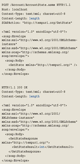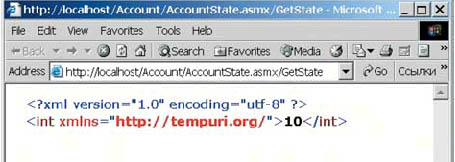 Не забудьте определить переменную state как static (полный код этого примера вы сможете найти на КП-диске). При вызове сервиса в Internet Explorer мы сможем прочитать пару "запрос-ответ" в формате SOAP. Для примера приведем текст запроса и ответа для функции int GetState() будет выглядеть следующим образом: