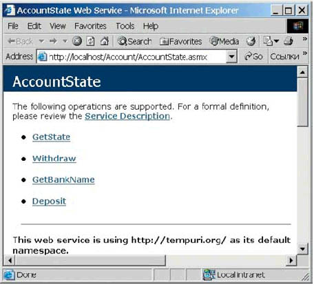 Рис. 2. Мы можем просмотреть все методы web службы прямо в Internet Explorer