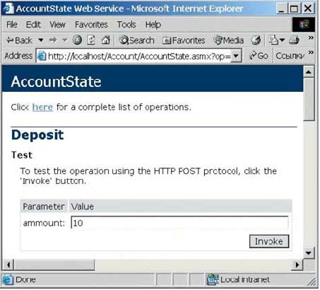 Если сравнить формат SOAP с ранее приведенным фрагментом в формате XML-RPC, сразу видно, что при наличии большого количества сложных объектов размер строки XML-RPC будет гораздо меньшим. Возможность тестировать методы прямо из Internet Explorer делает разработку сервисов еще более простым занятием. Внизу приведены рисунки, отображающие некоторые экраны в процессе тестирования.