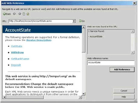 При этом необходимо создать в проекте веб-ссылку, для того чтобы Visual Studio мог сгенерировать промежуточную proxy-сборку. Таким образом, среда разработки берет всю черновую работу на себя, нам остается только создать экземпляр класса и вызвать его методы. Чтобы создать веб-ссылку, щелкните по контекстному меню на дереве проекта нашего клиента и выберите пункт add web reference. Появится интуитивный дружественный wizard. На рисунке показано его финальное диалоговое окно, где название ссылки изменено с localhost на AccountState.