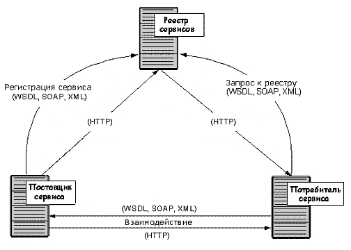 Джерими Уэстерман дает следующее определение SOA: это парадигма, предназначенная для проектирования, разработки и управления дискретных единиц логики (сервисов) в вычислительной среде. Применение этого подхода требует от разработчиков проектирования приложений как набора сервисов, даже если преимущества такого решения сразу неочевидны. Разработчики должны "выйти за границы" своих приложений и подумать, как воспользоваться уже существующими сервисами, или изучить, как их сервисы могут быть использованы их коллегами. SOA "подталкивает" к использованию альтернативных технологий и подходов (таких как обмен сообщениями) для построения приложений посредством связывания сервисов, а не посредством написания нового программного кода. В этом случае, при надлежащем проектировании, применение сообщений позволяет компаниям своевременно реагировать на изменение рыночных условий - "настраивать" процесс обмена сообщениями, а не разрабатывать новые приложения. Слова Джерими Уэстермана в определенной степени перекликаются с точкой зрения Клива Финкельштейна. "Родоначальник инфотехники" сетует, что до недавних пор термин "сервис-ориентированная архитектура" был синонимом "Web-сервис". Клив Финкельштейн определяет SOA следующим образом - вызов Web-сервисов с помощью средств и языков управления бизнес-процессами. Он считает, что SOA - это термин, который появился для описания исполняемых компонентов - таких как Web-сервисы - которые могут вызываться другими программами, выступающими в качестве клиентов или потребителей этих сервисов. Эти сервисы могут быть полностью современными - или даже устаревшими - прикладными программами, которые можно активизировать как черный ящик. От разработчика не требуется знать, как работает программа, необходимо лишь понимать, какие входные и выходные данных нужны, и как вызываются эти программы для исполнения. В самом общем виде SOA предполагает наличие трех основных участников: поставщика сервиса, потребителя сервиса и реестра сервисов (см. рис. 1). Взаимодействие участников выглядит достаточно просто: поставщик сервиса регистрирует свои сервисы в реестре, а потребитель обращается к реестру с запросом.
