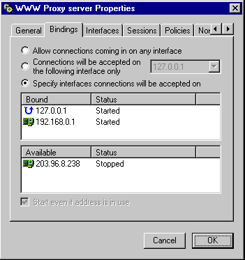 Страничка BindingsСтраничка Bindings (привязки) - основная в системе защиты WinGate firewall. Привязывание сервиса к интерфейсу означает, что этот сервис доступен только, если соединение происходит через этот интерфейс. Привязки могут разрешить доступ к сервису через один, несколько или все интерфейсы. Bindings содержит список всех возможшых интерфейсов. Сетевые карты, профили дозвона и адрес localhost (127.0.0.1) должны быть включены. Вы можете выбрать интерфейсы, через которые разрешен доступ к сервису. Например, вы хотите, чтобы ваш WWW proxy был доступен только пользователям вашей сети. Просто выберите нужный вам интерфейс и проверьте, что только ваша сетевая карта (возможно 192.168.0.1) и localhost (127.0.0.1) находятся в списке "Bound" (ограничение).