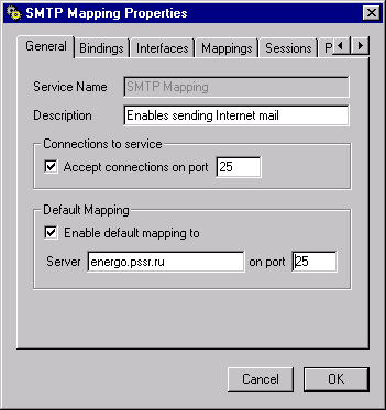 Настройка электронной почтыСтандартным протоколом переноса электронной почты в Интернет является протокол SMTP. Именно по этому протоколу почта передается от компьютера к компьютеру. Однако протокол SMTP требует постоянной готовности компьютера к приему/передаче почты, что не совсем удобно обычному пользователю. Поэтому чаще всего протокол SMTP используют для пересылки электронной почты между постоянно функционируемыми почтовыми серверами, на которых она может накапливаться до получения ее пользователями. Для взаимодействия с почтовыми серверами почтовые программы используют, чаще всего, два протокола: SMTP - для передачи почты на почтовый сервер и РОР3 - для получения почты с сервера. Такой метод и используется в Wingate. Стандартный порт для РОР3-соединений - 110, а для SMTP - 25. Программа установки Wingate создает сервис SMTP Mapping (TCP Mapping сервис) на порт 25 и сервис POP3 Proxy server на порт 110, если это было заказано. Сервис SMTP Mapping перенаправляет почту, получаемую от пользователя, на почтовый сервер, а сервис POP3 Proxy server является посредником между почтовым сервером и пользователем при получении почты. Если, например, energo.pssr.ru - это почтовый сервер вышего провайдера, то настройки SMTP Mapping должны быть следующими:
