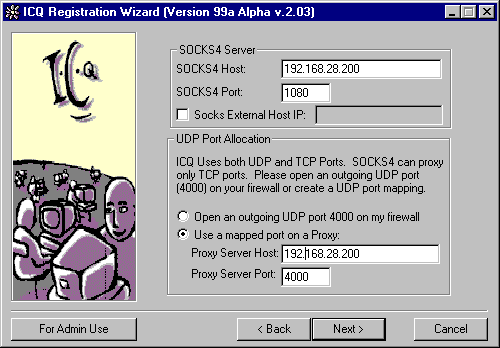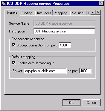 Замечание. Но у меня через Socks5 ICQ так и не заработало, поэтому я настроил "аську" через Socks4. См. ниже. В GateKeeper добавил UDP Mapping service и настроил его как на картинке ниже. Замечание. Имя сервера ICQ - icqalpha.mirabilis.com, а порт - 4000.