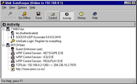 Это обычный вид для всех пользователей WinGate users. WinGate настраивается и управляется с помощью GateKeeper. GateKeeper взаимодействует с WinGate через защищенную TCP/IP связь, для просмотра, управления и настройки. GateKeeper используется для настройки, но не имеет существенного значения непосредственно для доступа в Интернет. Вам не надо использовать GateKeeper для доступа в Интернет. С лицензией Pro Gatekeeper можно использовать на любой машине, имеющей связь по протоколу TCP/IP с сервером WinGate. Это может быть сервер WinGate, друной в вашей сети, или любая машина в Интернет! Панель Activity - окно администратора WinGate. Здесь все сессии (соединения пользователей с Интернет) показываются в режиме реального времени. Администратор может использовать этот экран для управления и удаления любой сессии. Различные символы используются для показа различных действий, происходящих в GateKeeper. Они обьясняются ниже. Все иконки на экране Activity отображают сессиии различных типов. Они видны, когда сессия активна, и исчезают по ее окончании. Сессии данных Сессии данных- пример каких-нибудь используемых прокси или сервисов. Сессии данных всегда показывают активную машину (сетевое имя или IP-адрес) и имя пользователя (или Guest). Сессии пользователя Показываются с помощью иконок пользователей (см. ниже). Сессии пользователя показывают, кто из пользователей использует Wingate и сессии каких данных они открыли. Это означает, что если кто-то не регистрируется, то он виден только, когда он имеет активную сессию данных. Если же пользователь зарегистрировался, то он появится с иконкой "ключ" и останется в окне Activity до тех пор пока не закончит работу (logout). Logged in users count as a user for licensing purposes all the time they are logged in. Пользователи объясняются в следующей сессии.