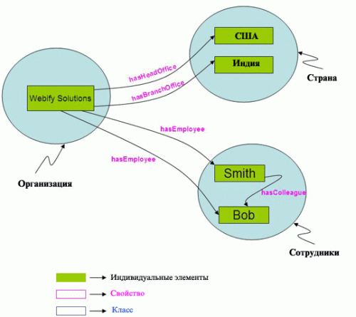 Элемент RDF в листинге 1 несет информацию о ресурсе, в данном случае это компания http://www.w3.org/Organization/contact#WebifySolutions. Компания может быть идентифицирована по URI http://www.w3.org/Organization/contact#WebifySolutions, ее название - Webify Solutions, ее e-mail - info@webifysolutions.com, а номер телефона - 1-800-4WEBIFY. На рис. 1 показан управляемый граф связей, представляющий ту же информацию. Рис. 1. Граф RDF, описывающий контактную информацию компании Webify Solutions Стандартные способы описания свойств данных - схема RDFСхема RDF - это семантическое расширение RDF. Она обеспечивает механизмы описания связанных ресурсов, а также собственно этих связей. Система классов и свойств схемы RDF похожа на систему типов языков объектно-ориентированного программирования, таких, например, как Java, но отличается от многих других систем. Так, описательный язык словаря RDF определяет свойства в терминах того класса ресурсов, к которому эти свойства относятся. Другие системы же описывают класс в терминах свойств его элементов. RDF и схема RDF основаны на XML и схеме XML. Существование стандартов для описания данных (RDF) и их атрибутов (схема RDF) позволяет создавать пакеты легко доступных инструментов для чтения и использования данных из многочисленных источников. То, насколько глубоко различные приложения могут обмениваться данными и использовать их, иногда называется синтаксическим взаимодействием сетей (syntactic interoperability). Чем более стандартизированными и распространенными являются эти инструменты работы с данными, тем выше степень синтаксического взаимодействия сетей и тем легче и привлекательнее становится использование подхода на основе семантических сетей по сравнению с точечными интеграционными решениями. Ссылку на полный пакет моделей данных и спецификаций схемы RDF консорциума W3C можно найти в разделе Ресурсы. Стандартные способы описания связей между объектами данных: онтология, определяемая с помощью онтологического языка WebСинтаксическое взаимодействие сетей - необходимое условие для того, чтобы множественные приложения могли по-настоящему "понимать" данные и работать с ними как с информацией. Это также необходимое условие для корректной проверки данных. Синтаксическое взаимодействие сетей требует преобразования ("мэппирования") между терминами, для чего, в свою очередь, необходим контент-анализ. Такой контент-анализ требует формальных и подробных спецификаций моделей доменов, которые определяют используемые термины и их связи. Подобные формальные модели доменов иногда называются онтологиями. Они определяют модели данных в терминах классов, подклассов и свойств. Онтологический язык Web (Web Ontology Language), рекомендуемый консорциумом W3C, помогает в выражении онтологий. Рабочий онтологический язык (Ontology Working Language, сокр. OWL) добавляет больше словарных возможностей для описания свойств и классов, чем RDF или схема RDF. В частности, он позволяет описывать связи между классами (например, неперекрываемость), мощность множества (например, "ровно один"), равенство, более богатую типологию свойств и их характеристики (например, симметрия). Онтологический язык Web на основе OWL разработан для использования приложениями, которые должны работать с содержанием информации, а не просто предоставлять ее пользователю. OWL улучшает возможности автоматической интерпретации содержимого интернета по сравнению с теми, что могут обеспеч