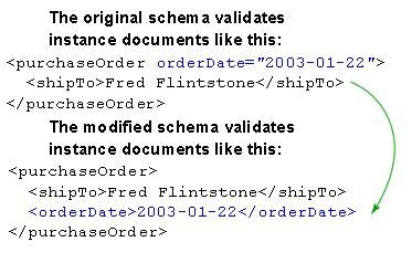 Рис.1. Преобразование атрибутов в элементы Краткое изложение применяемого подходаЕсли вы вспомните о сложной структуре XML-схем, вы вряд ли захотите воспользоваться Notepad, чтобы редактировать xsd-файлы. Любой хороший XML-редактор не на много лучше - несмотря на то, что он, возможно, отлично организовывает элементы и атрибуты, он не может показывать многочисленные абстрактные отношения Infoset, которые определены в спецификации Schema. Именно здесь на выручку приходит Модель Schema Infoset: она выражает и конкретное DOM-представление набора документов схемы, и полную абстрактную Infoset-модель схемы. Оба эти представления демонстрируются с помощью программного API Модели, а также встроенного редактора схем.