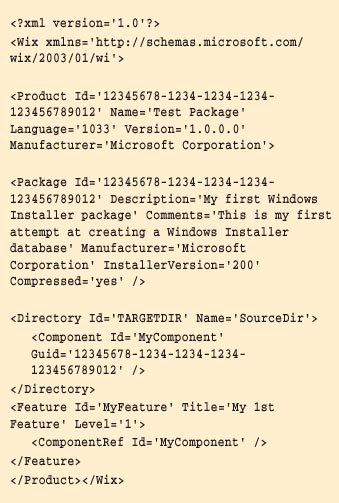 Вы можете создать этот файл и откомпилировать его с помощью компилятора candle, чтобы убедиться в работоспособности данного файла. Если ваш файл называется, к примеру, 1.wxs, то командная строка будет выглядеть как candle 1.wxs. Если не обнаруживаются ошибки, то процесс компиляции не будет сопровождаться каким-либо сообщениями, кроме заголовка компилируемого файла (да и его можно подавить, задав ключ -nologo). В результате вы получите файл с тем же именем, что и ваш WXS, но только с расширением wixobj. Этот файл содержит всю информацию о составе дистрибутива, но не сами файлы — таким образом вы можете компилировать wix-файлы реже, чем выполнять сборку, поскольку компиляция нужна, только если вы изменяете состав инсталляции. Обновление самих файлов не требует повторного применения candle.