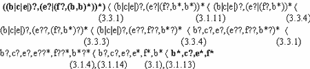 Определение 22 (Вторая нормальная форма) Схема S=(T,E,A,p,a,r) представлена во второй нормальной форме (слабо-эквивалентная нормальная форма), если: Teoрема 6 (Существование второй нормальной формы) Для любой схемы S=(T,E,A,p,a,r) существует схема слабо-эквивалентная ей, представленная во второй нормальной форме. Для доказательства этой теоремы, необходимо воспользоваться результатами Теоремы 5. Для исходной схемы S существует эквивалентная схема S', структурные ограничения которой имеют вид r0|..|rn , где Пример 7 Приведем регулярное выражение из предыдущего примера ко второй нормальной форме. (b|c)?,(f?,b*)* 4.3. Третья нормальная форма.Определение 23 (Простые регулярные выражения) Простые (п.) регулярные выражения над множеством E (regS(E))определяются следующим образом: